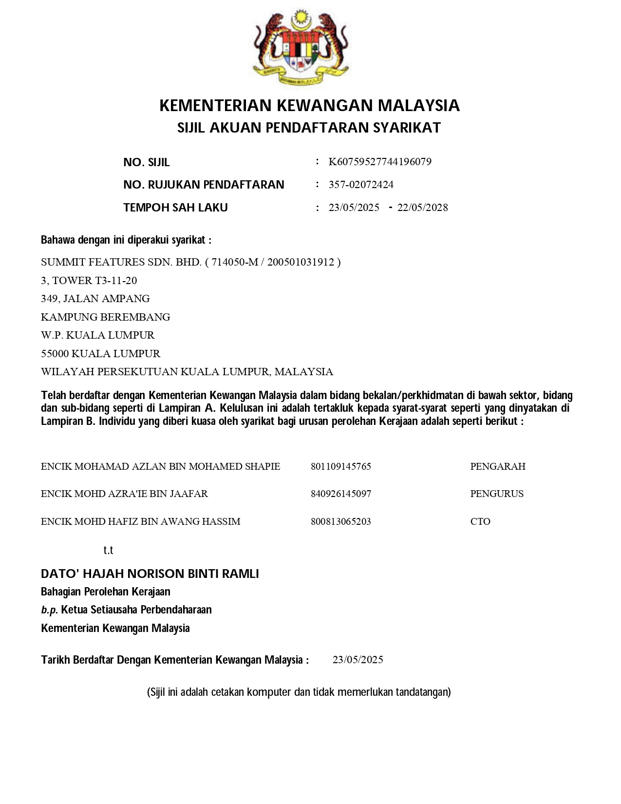 ALL RIGHTS RESERVED BY SUMMIT FEATURES SDN. BHD. (714050-M)